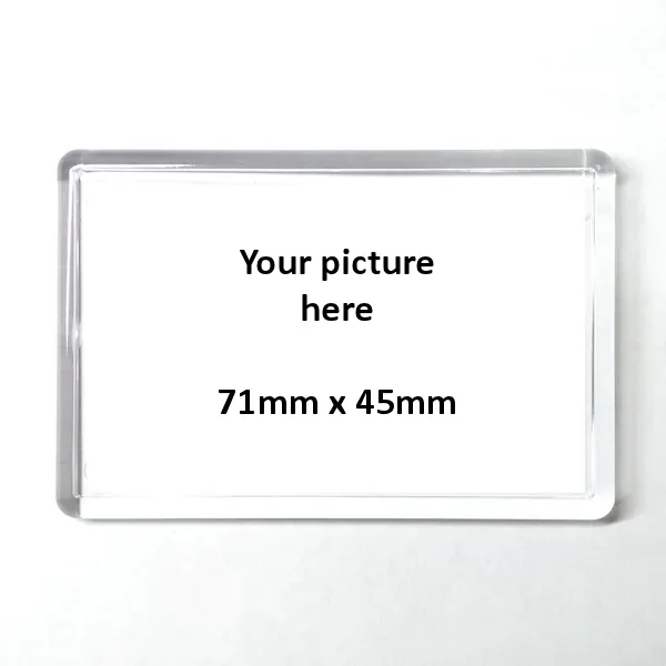 Picture size will be 71mm x 45mm placed inside a 77mm x 52mm x 5mmdurable acrylic plastic magnet blank.